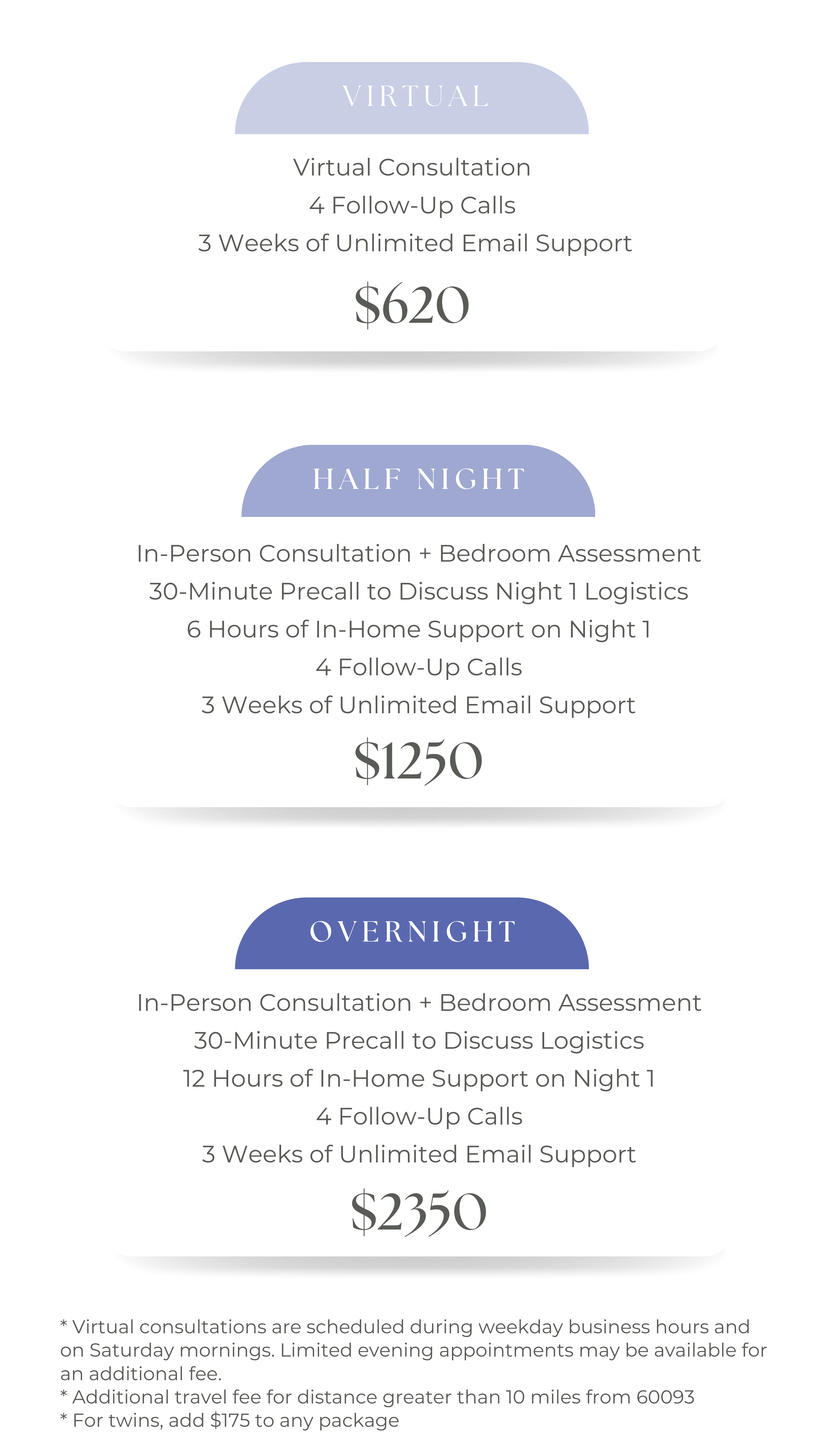 We'll either have a 60-75 minute consultation by phone or Zoom or in person, depending on which package you choose. We'll go over everything you need to know for Night 1, the first day of naps and beyond.